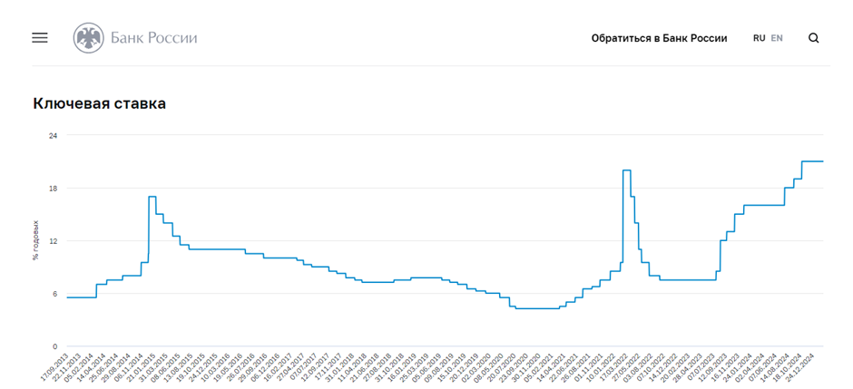 • 2025: текущая ставка 21%, прогноз на конец года — 15–17% (РБК, 29.12.24).
